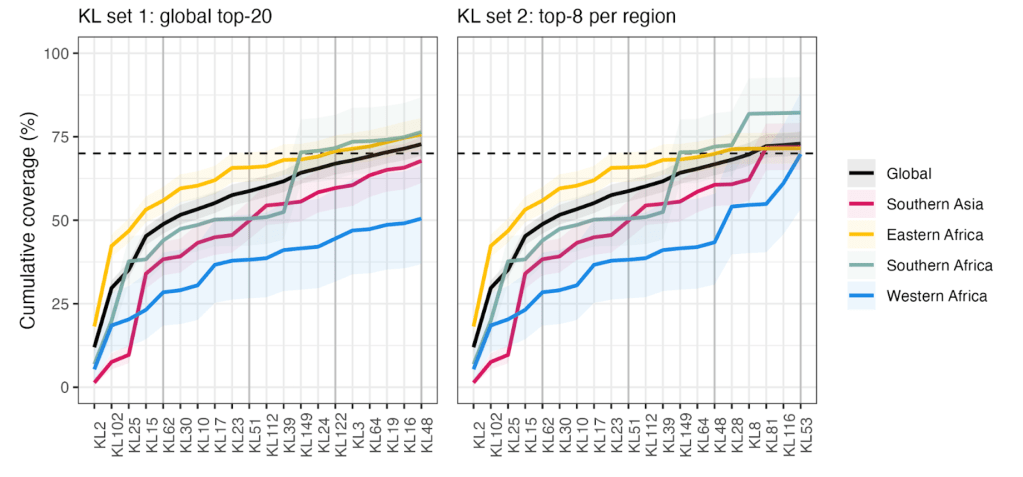 Figure caption: Theoretical population coverage of an anti-K. pneumoniae vaccine targeting 20 capsule types. Each panel shows the cumulative proportion of newborn sepsis isolates represented by various combinations of capsule (K) loci. Coloured lines indicate the coverage by sub-continental region and globally. The left panel shows the coverage for combinations of K loci selected as the top 20 globally. The right panel shows the coverage for combinations of K loci selected as the top 8 from each region (some are overlapping). The target population coverage of 70% is indicated by the dashed line. The target is exceeded in all regions with the K locus combination on the right, but not that on the left.